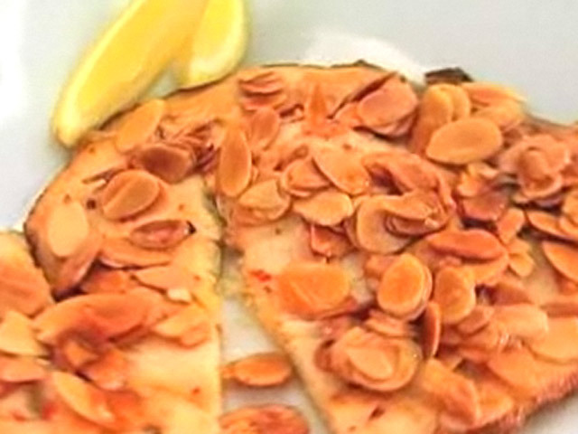 Рецепт кухни Туниса.На 1 порцию:рыба-меч, лимонный сок, оливковое масло, соль, чили, миндальные хлопья.
