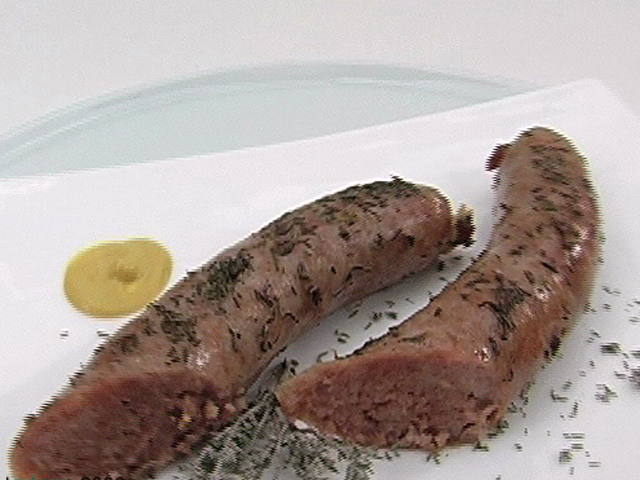 Простая, но очень вкусная и ароматная печеная закуска.Состав:колбаса — 1 порция;тимьян — 1 пучок;горчица — 2 столовых ложки;оливковое масло по вкусу.