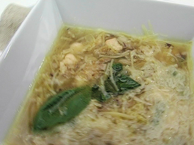 Куриный суп с грибами и пастой.Состав:курица — 100 гр;куриный бульон — 400 гр;вермишель — 30 гр;грибы — 100 гр;сыр — 1 столовая ложка;лук — 1 штука;оливковое масло, соль, перец — по вкусу.